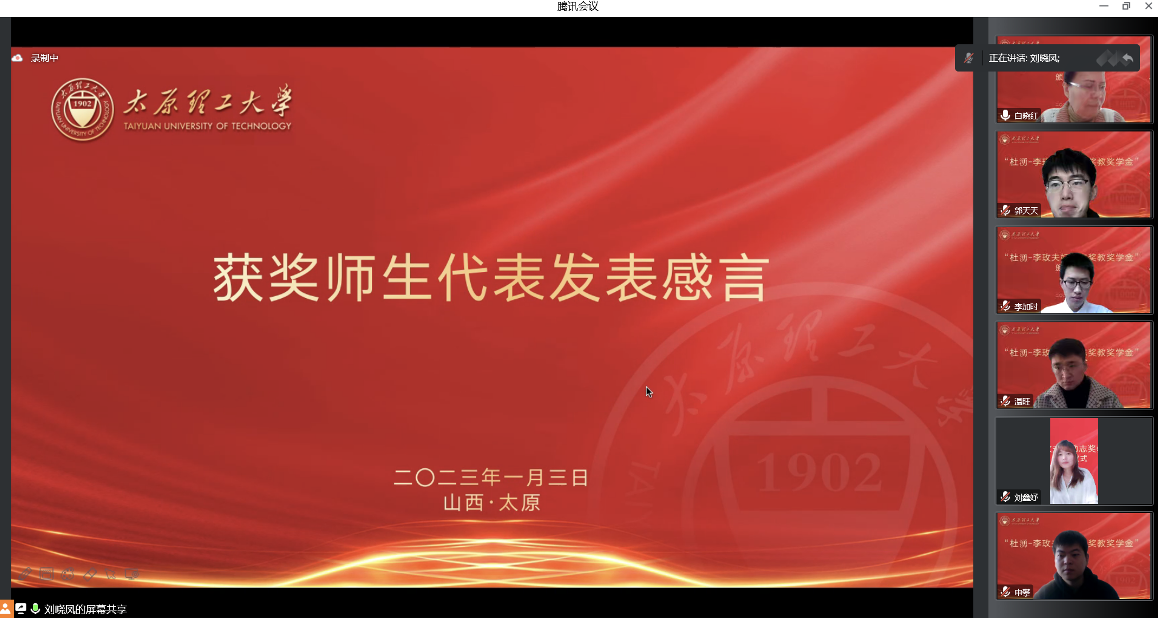 颁奖仪式上,芦书记对2021年获奖师生在2022年取得的成果进行了总结汇报。随后,奖教奖学金评审委员会主席白晓红教授宣读了2022年“杜湧-李玫夫妇励志奖教奖学金”获奖名单,刘晓凤、谢明星两位教师获得“杜湧-李玫夫妇励志奖教金”;郭天天、祁刚、李加时、温旺、刘鑫妤、申攀六位在读研究生获得“杜湧-李玫夫妇励志奖学金”。白晓红教授和杜湧-李玫夫妇为获奖师生进行了颁奖,并对获奖师生提出了祝贺与殷切关怀,获奖师生表示了诚挚的谢意。