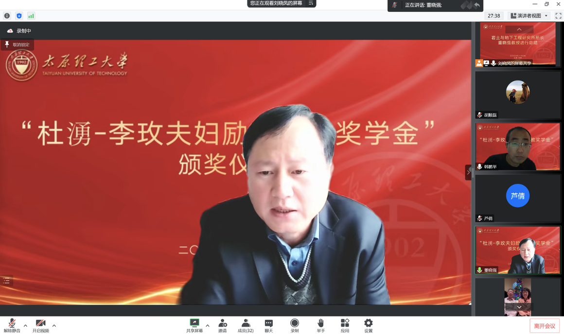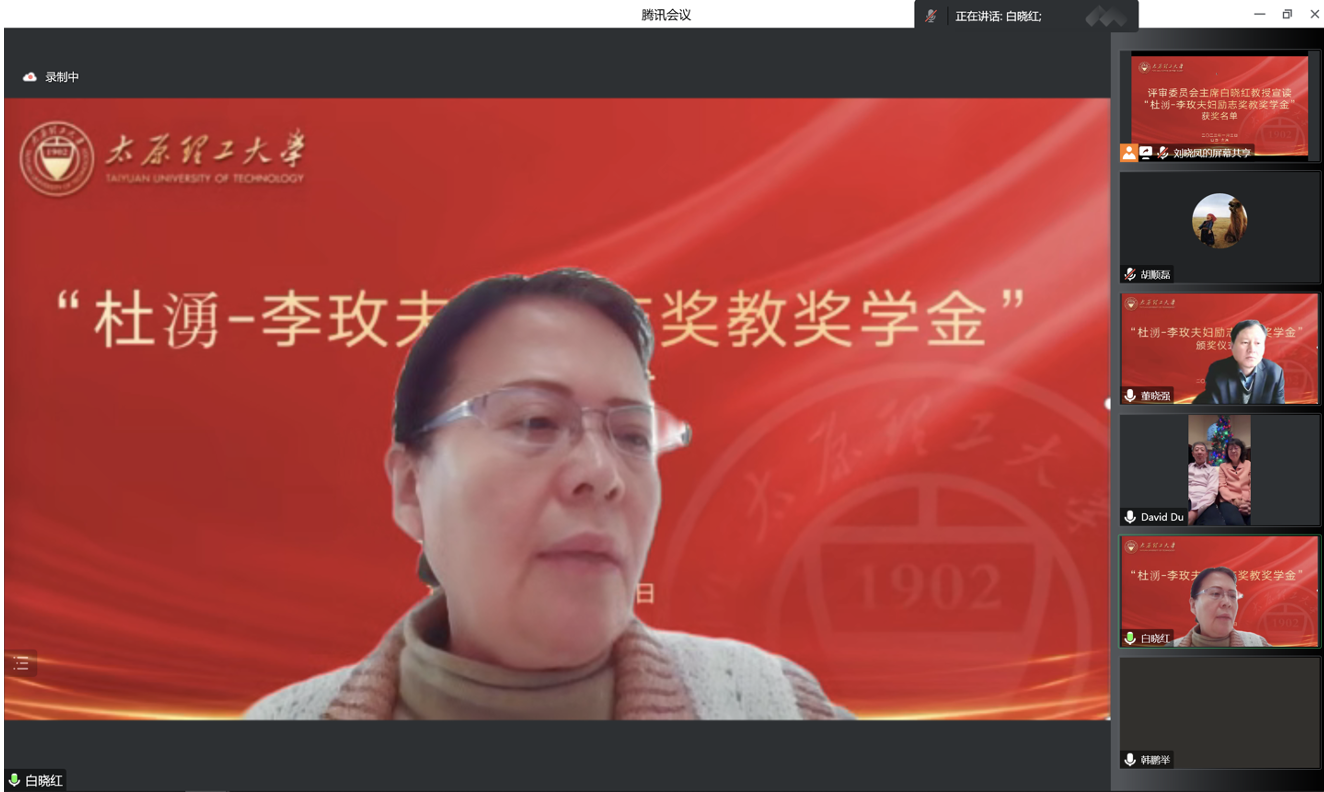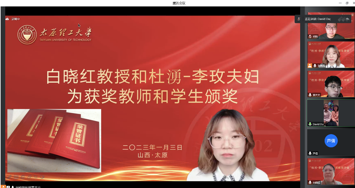 2023年1月3日上午,腾讯会议线上举行了2022年“杜湧-李玫夫妇励志奖教奖学金”颁奖仪式,此次颁奖仪式由学院党委副书记芦倩主持,岩土与地下工程研究所师生和杜湧-李玫夫妇参加了颁奖仪式。