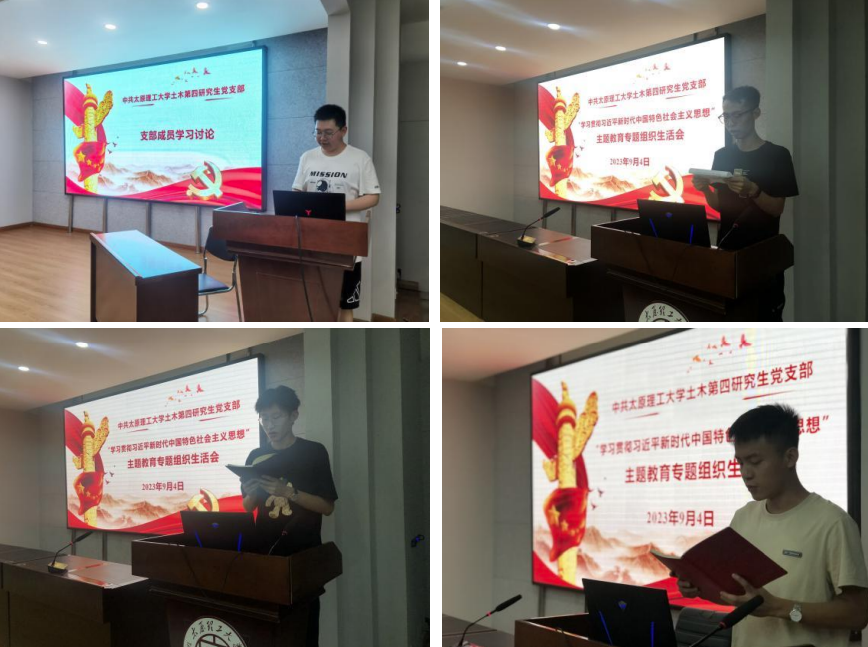 根据习近平总书记关于开展主题教育的重要讲话精神、《中共中央关于在全党深入开展学习贯彻习近平新时代中国特色社会主义思想主题教育的意见》(中发〔2023〕6号)以及《关于在学习贯彻习近平新时代中国特色社会主义思想主题教育中开好专题民主生活会的通知》(校党组[2023]26号)要求,9月4日,土木第四研究生党支部在博学馆A座五层会议室召开学习贯彻习近平新时代中国特色社会主义思想主题教育专题组织生活会。