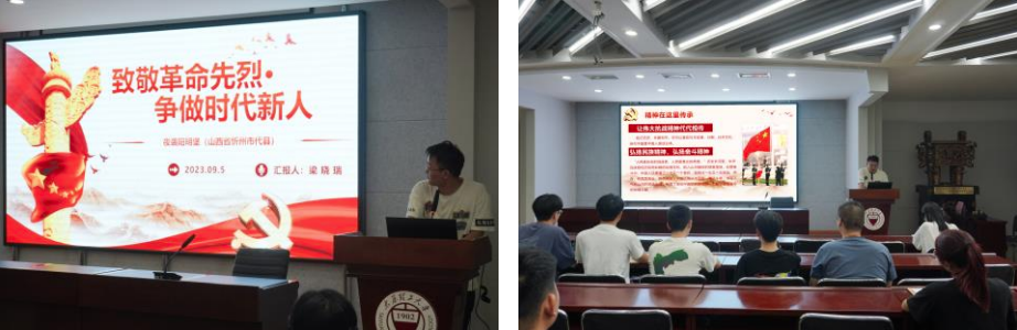 会议伊始,由梁晓瑞同志带领支部党员进行“致敬革命先烈,争做时代新人”专题学习。9月3日是中国人民抗日战争胜利纪念日,为纪念这个意义重大的日子,专题学习以“夜袭阳明堡”为具体事例,结合现有的影视作品及文字资料,向支部党员介绍了革命先烈在抗日战争中的英勇事迹。支部全体党员都深刻意识到中国人民在挫折和挑战面前,从不屈服、勇于斗争,书写下气壮山河的英雄史诗,孕育了坚韧不拔的民族精神,汇聚起爱国奋斗的磅礴力量。