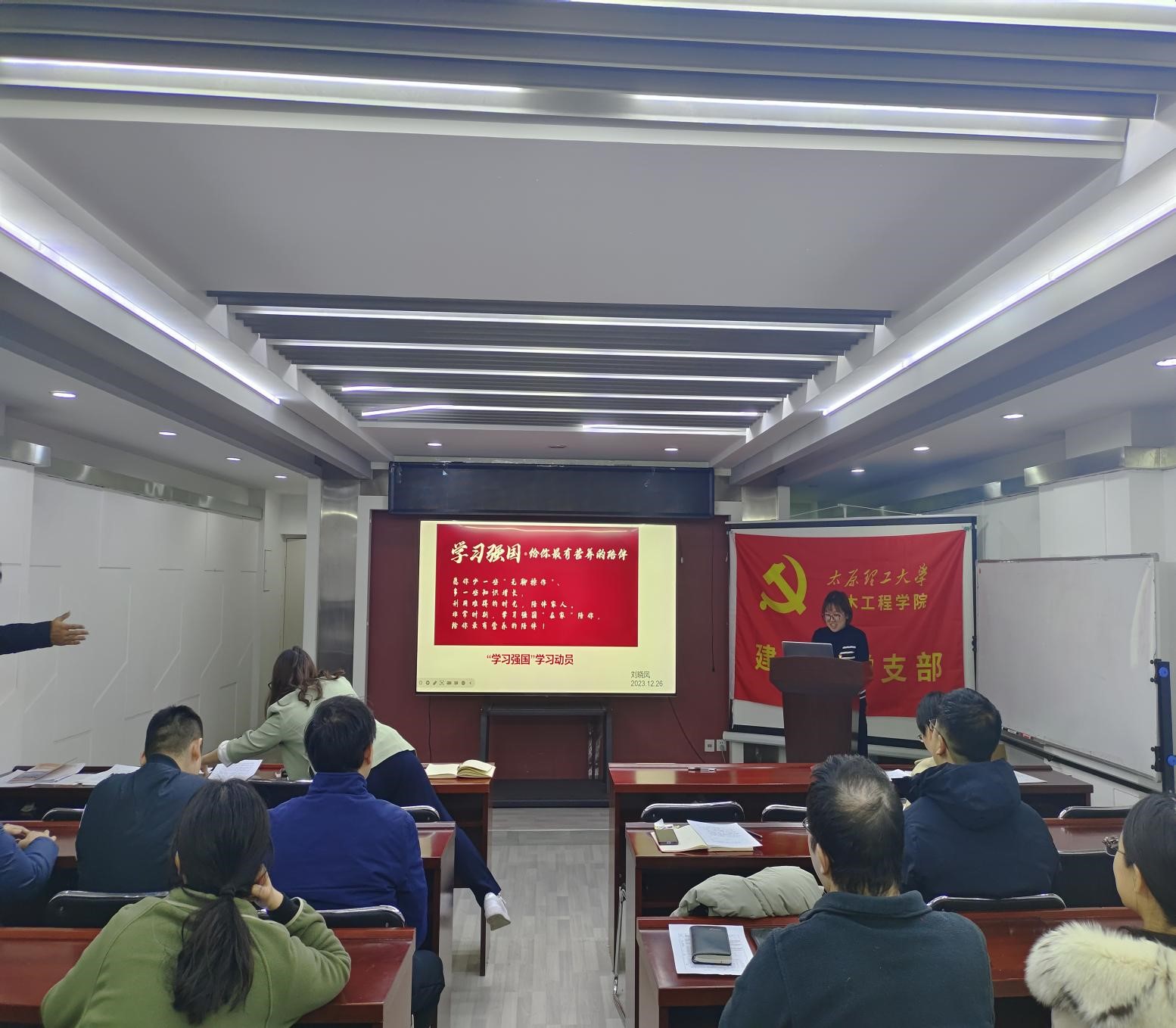 12月26日下午,建工系党支部在博学馆A座五层岩土报告厅召开2023年度总结暨党员民主评议大会,会议包括工作总结、民主评议、观看《榜样8》、学习强国的学习动员等环节,会议由党支部书记程欣主持。