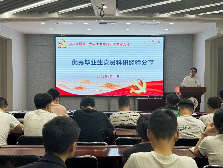 为了进一步发挥党建工作对研究生科研学习的重要引领作用,共同营造党支部良好的科研学习氛围。土木第四研究生党支部于2024年6月14日在博学馆A座五层会议室召开优秀毕业生党员科研经验分享会及毕业生党员座谈会,优秀毕业生党员刘建飞同志分享三年研究生的学习和科研心得,党支部书记邱斌同志与毕业生党员深入交流并殷切寄语。