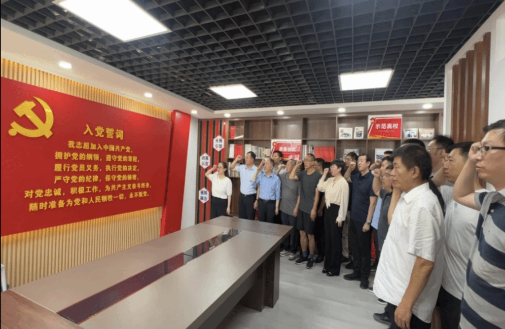 在交流互动环节,支部全体党员在党旗下庄严宣誓,重温入党誓词,回顾入党的初心和使命。