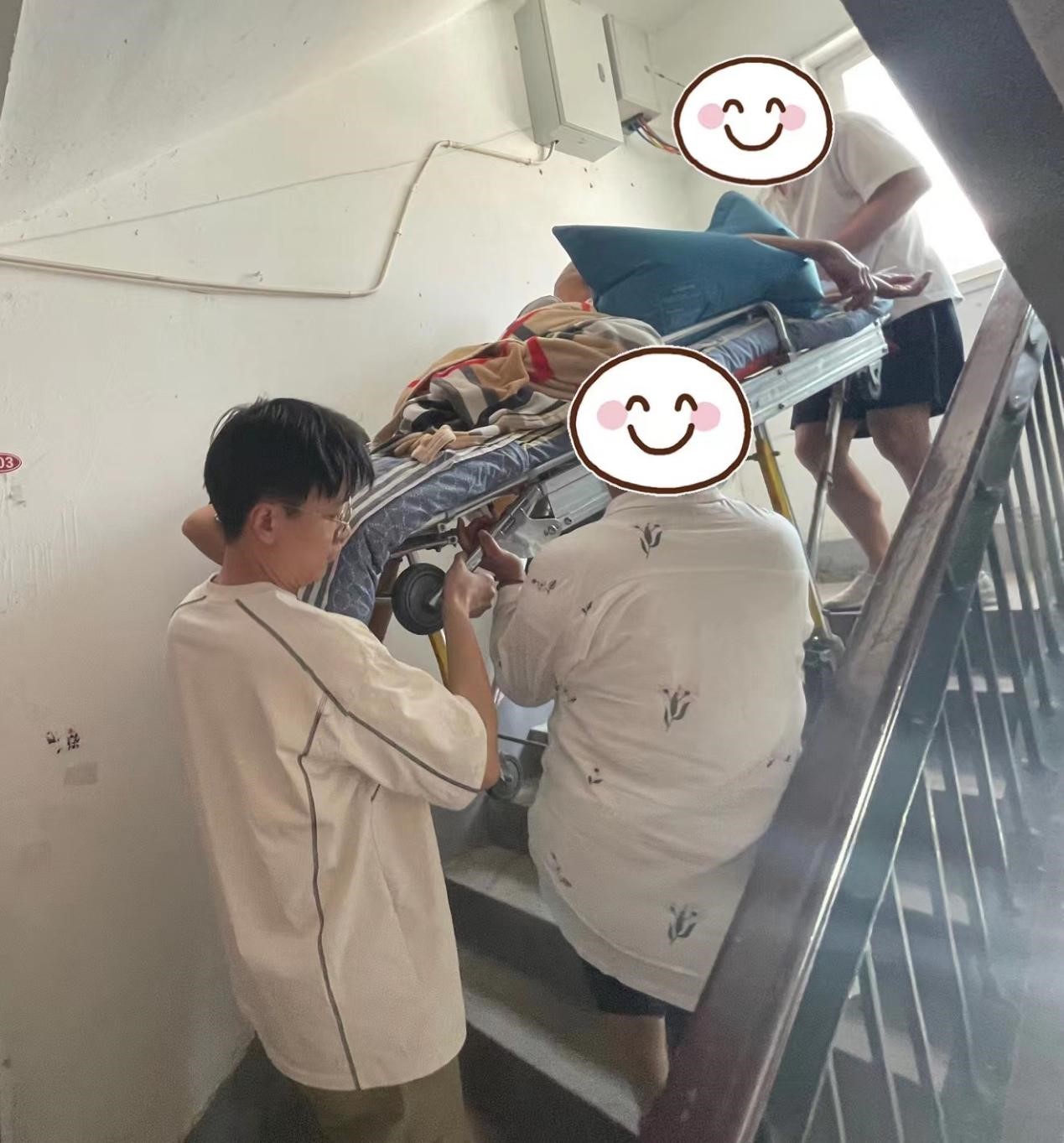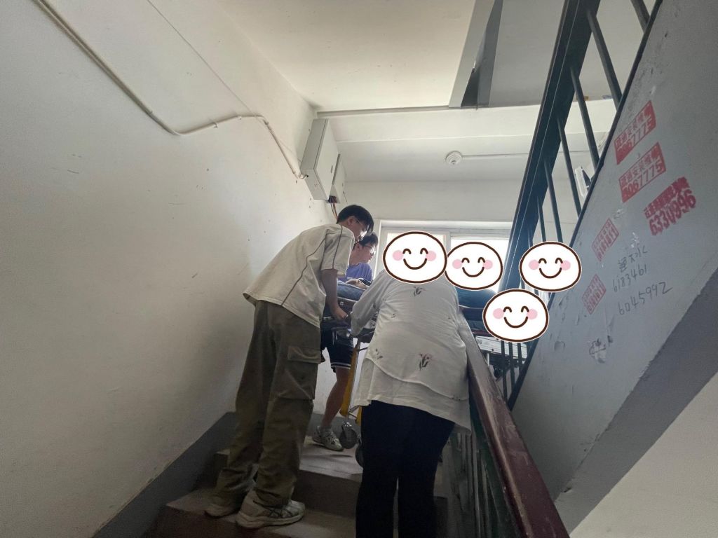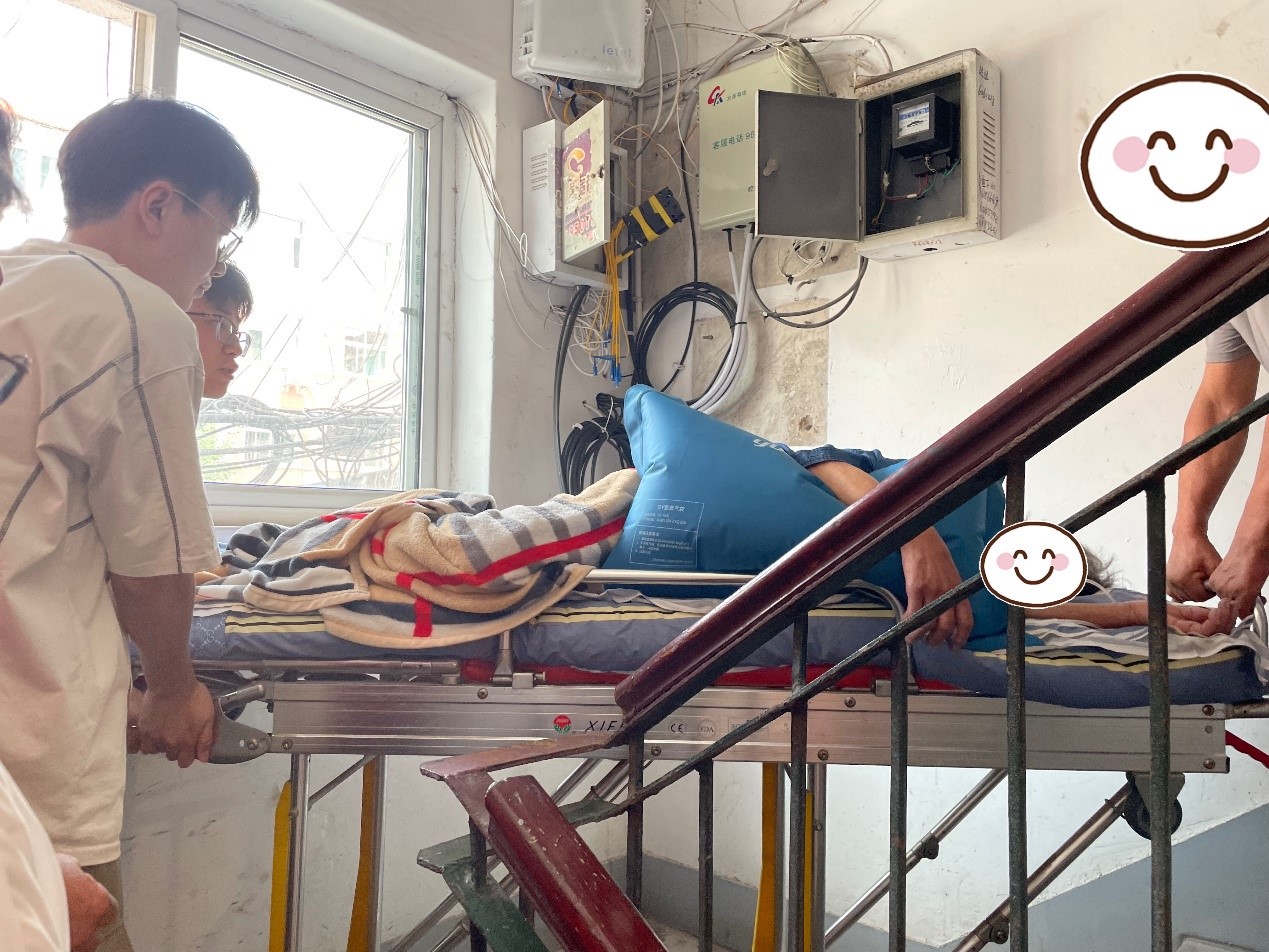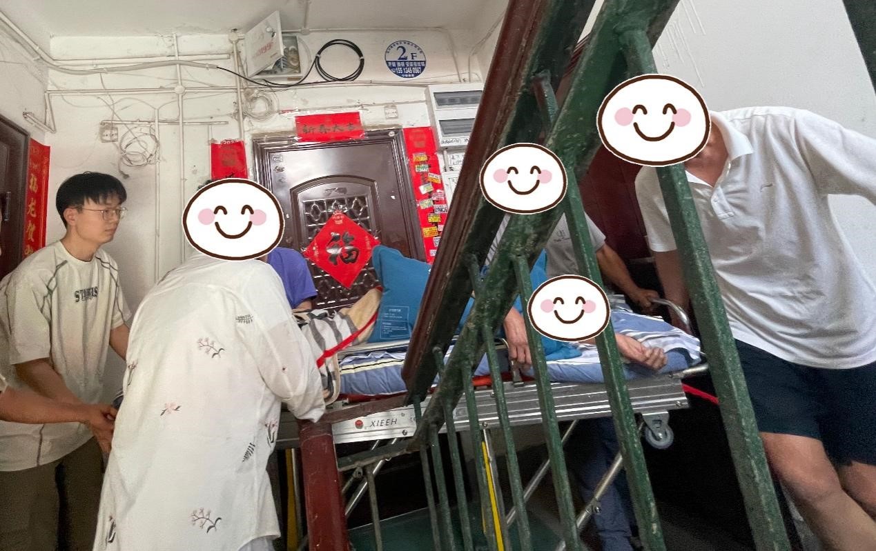 2024年6月13日中午11点半,土木第一研究生党支部书记柳丽接到一名永利304官网唯一教职工的求助信息,对方称其居住在永利304官网唯一西院住宅小区无电梯的住宅楼4楼,其家属中午12点将从医院治疗出院归来,但由于行动不便依旧卧于担架车上,而其他男性亲友有事无法前来,该名教职工及女性家属将出院家属抬上楼存在困难,所以希望能得到志愿者的帮助。柳丽同志在了解具体情况后,随即号召支部张鹏昆、曹培格、岳中华、张凯4名党员,积极承担抬担架助群众回家的“伸出援手,照亮他人”志愿服务,大家没来得及吃午饭便前往永利304官网唯一西院住宅小区进行帮忙。
