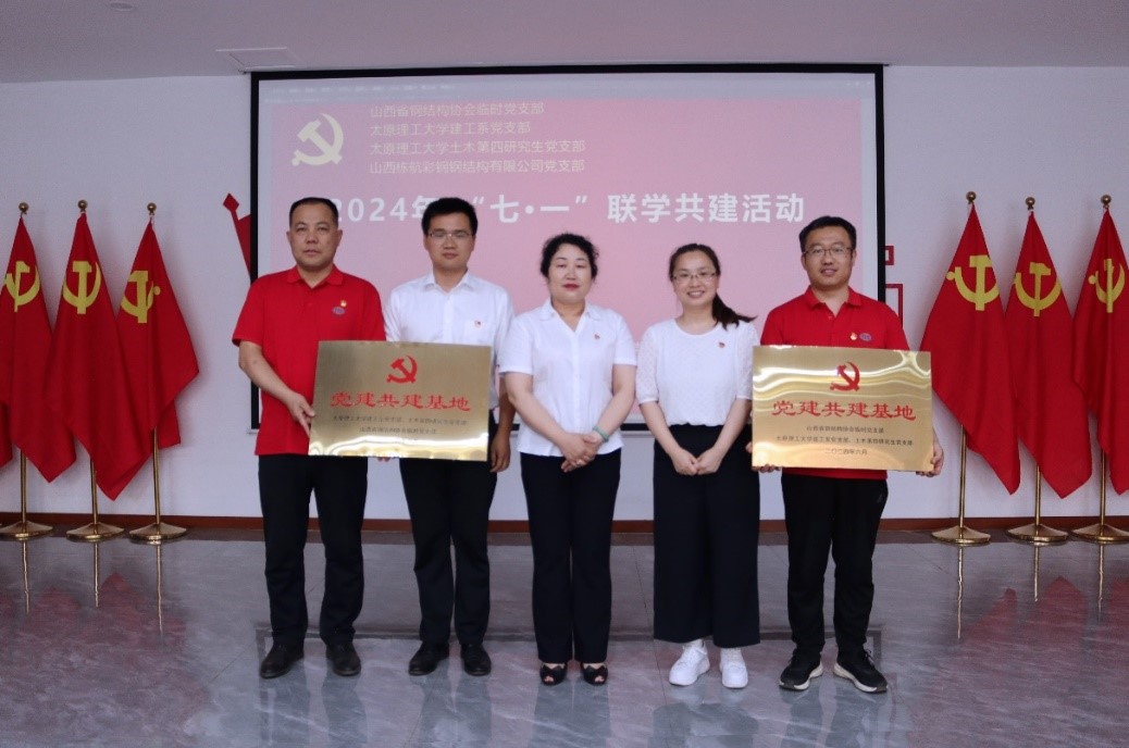 为庆祝中国共产党成立103周年,进一步深入学习贯彻落实习近平新时代中国特色社会主义思想及党的二十大精神,全面推进基层党组织建设,积极探索“党建+业务”深度融合模式,构建“党建引领、校企合作、发展共赢”的党建新格局。2024年6月28日上午,永利304官网唯一建工系党支部联同土木第四研究生党支部、山西省钢结构协会临时党支部和山西栋航彩钢钢结构有限公司,共同举办了七一党建共建活动,并举行了党建共建基地的揭牌仪式。参加此次活动的主要人员有:山西省钢结构协会临时党支部书记沈沛鸿、会长李海旺、秘书长兼支部副书记石彦卿、常务副会长张波、副秘书长李卫文,永利304官网唯一建工系党支部书记程欣、副书记孟宪杰、党小组组长刘瀚超,土木第四研究生党支部书记邱斌及山西栋航彩钢钢结构有限公司董事长王国栋、总经理闫峰、总工程师朱学强、业务总监霍永结、生产总监王飞、财务总监曹彩庆、党支部书记张继良等。