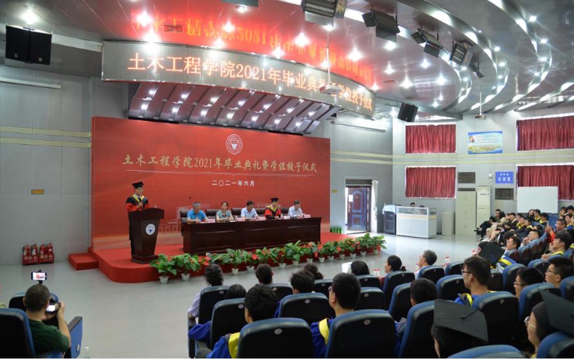 The graduation ceremony kicked off with the inspiring national anthem of the People's Republic of China. Afterwards, Zhou Wei announced the list of 2021 outstanding graduats of the College of Civil Engineering and presented awards to them. Ge Xinsheng informed the employment situation of our 2021 graduates. Du Zhenyu announced the results of the 2021 undergraduate graduation project (thesis) selection.