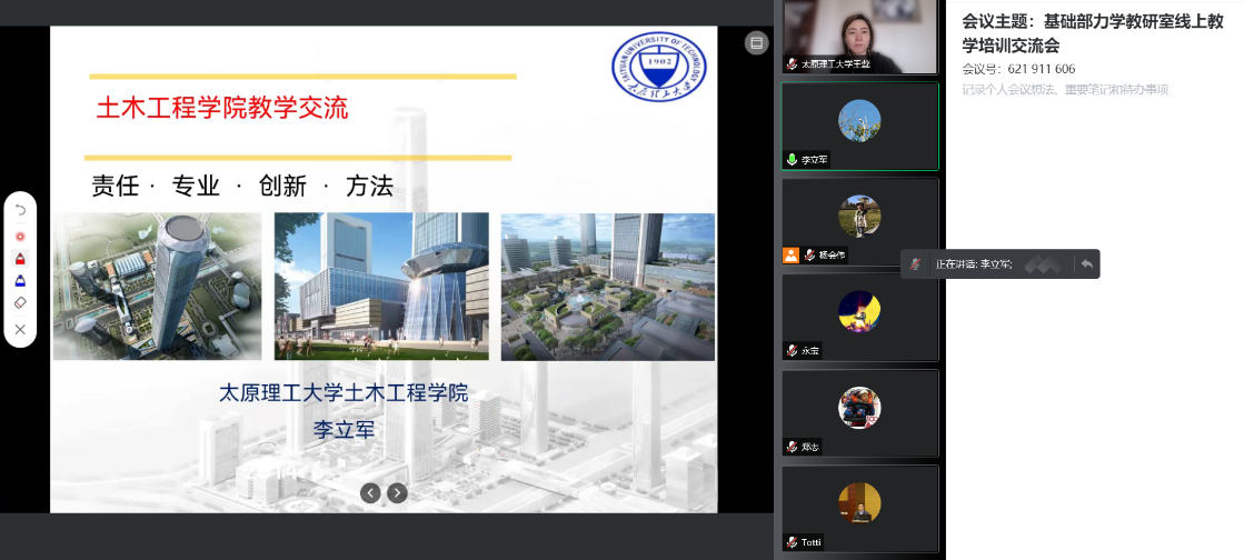 为切实做好疫情防控期间教学工作,基础部力学教研室于2022年4月15日举行线上教学培训与研讨专题会。会议由土木学院基础部主任、山西省一流课程《结构力学》负责人王蕊教授主持,邀请土木学院建筑工程系李立军老师进行经验分享和教学指导,结构力学课程团队全体老师参加了本次会议。